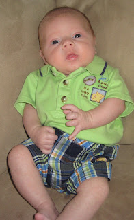 Braiden had his two month appointment the other day and he is doing great! He now weights 9 lbs. 1 oz. and is 21 1/2 in. long. Compared to the average two month old, Braiden is a little guy. However, since they go by his gestation age, which is two weeks old, he's a big, strong boy! Recently, we found out that along with all the discomfort Braiden's been in, he also has an umbilical hernia. The pediatrician says that for preemies this is not uncommon and by 4 years of age they usually correct themselves. So, for now we are just supposed to monitor it and make sure no complications arise. We are going to see a GI specialist next week to try and figure out what's been causing Braiden the discomfort. Luckily, we think that they are not going to find anything as he has been a very happy baby lately. He is sleeping much better and does not grunt loudly in pain anymore. We think his pain could have had something to do with the fact that his digestive system is so immature and we were switching formulas on him every week to try and find one that worked for him. He is now on soy formula and seems to be doing great. Every day with Braiden is better than the day before. I never knew it was possible to love one little person so very much!